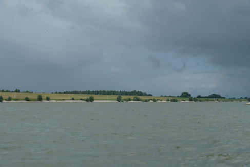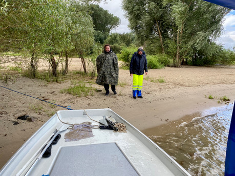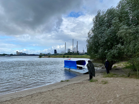Auf der Höhe von Marxloh bei KM 785 unmittelbar nach einem der riesigen Stahlwerke von ThyssenKrupp kam eine schwarze Regenwand auf uns zu und wir beschlossen diesen Regen an Land abzuwarten und fuhren auf eine Sandbank. Der Spuk dauerte zum Glück nicht allzu lange und so konnten wir die Fahrt fortsetzen. Allerdings wechselten sich dann Sonne und Regen regelmässig ab (buchstäbliches Aprilwetter im August!) und wir beschlossen durchzufahren. Wir sind ja Wettermässig einigermassen gut ausgerüstet, aber Spass machte es trotzdem nicht. Bei KM 816 sind wir trotz zum Teil starken Gegenwind und vielen Wellen relativ zügig im Yachtclub bei Wesel angekommen und hatten noch Glück einen freien Liegeplatz zu erhalten. Unser Liegeplatznachbar erkannte uns, er hat uns bereits in Köln gesehen und fuhr ab Köln bis Düsseldorf immer hinter uns. Er findet unser Projekt toll und beglückwünschte uns zu unserer Leistung es schon mal bis kurz vor die holländische Grenze geschafft zu haben.